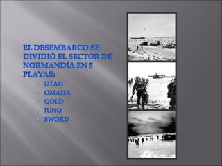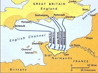 Las tropas aliadas, dirigidas por el general Eisenhower y el mariscal Montgomery, llevaron a cabo la invasión de Normandía el 6 de junio de 1944 con 3.5 millones de hombres y miles de naves y aviones para abrir un segundo frente contra la Alemania nazi y aliviar la presión sobre la Unión Soviética. La invasión tomó a los alemanes por sorpresa a pesar de sus defensas en la Muralla del Atlántico y la resistencia de mariscales como Rommel, permitiendo que los aliados consolidaran su posición en Normand