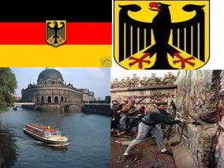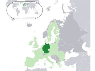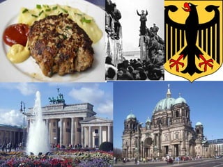 Alemania es una república federal con 82 millones de habitantes. Tiene una rica historia cultural con figuras destacadas como Bach, Beethoven y Goethe. Berlín es su capital y centro cultural, conocida por monumentos como la Puerta de Brandeburgo y el Muro de Berlín. Otras ciudades importantes son Múnich, donde se celebra la Oktoberfest, y Stuttgart, conocida por su feria de arte.