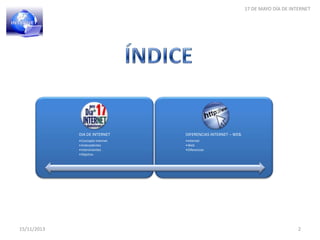 Internet es una red de redes descentralizada que conecta computadoras a través de protocolos. El 17 de mayo se celebra el Día de Internet para promover el uso de las tecnologías de la información. Aunque Internet y la World Wide Web a menudo se usan indistintamente, Internet es la red subyacente de máquinas interconectadas, mientras que la Web es el sistema de documentos hipertextuales que usamos para acceder a los recursos de Internet.
