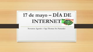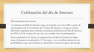 El documento habla sobre el Día Internacional de Internet, que se celebra el 17 de mayo. Explica que surgió en España en 2004 y que ahora se celebra en todo el mundo. También describe algunos de los beneficios de Internet, como el acceso a información educativa y la comunicación a través de redes sociales. Finalmente, ofrece consejos para un uso seguro y respetuoso de Internet, como proteger la privacidad, evitar conflictos y ser cuidadoso con la información personal que se comparte.