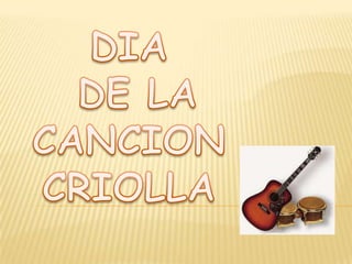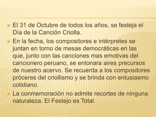 El documento describe la celebración del Día de la Canción Criolla en Perú el 31 de octubre, en la que se reúnen compositores e intérpretes para cantar canciones populares peruanas y recordar a compositores importantes del criollismo. También menciona a la "Palizada", un grupo de niños que popularizó la música criolla en Lima a principios del siglo XX, y destaca a Felipe Pinglo Alva como el máximo exponente de la canción peruana en la década de 1920.
