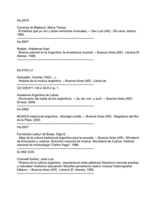 Este documento presenta una bibliografía sobre la tradición en Argentina. Incluye libros, artículos y documentos sobre el habla popular argentina, el folklore, la música tradicional, las lenguas indígenas, la cultura gauchesca y el mate. Abarca temas como refranes, creencias, supersticiones, el diablo indígena, la enseñanza musical colonial, biografías de músicos folklóricos y la tradición aborigen. Presenta una amplia variedad de fuentes para estudiar la cultura y las tradiciones de