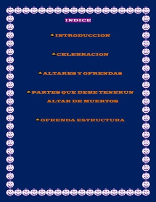 Este documento describe las tradiciones y costumbres del Día de Muertos en México. Explica que se trata de una celebración mexicana en la que se honra a los difuntos el 1 y 2 de noviembre. Incluye detalles sobre los orígenes prehispánicos de la festividad, así como las tradiciones actuales de preparar altares y ofrendas para recibir a los muertos y festejarlos.