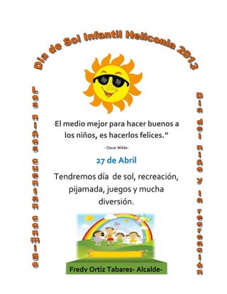 El documento presenta la programación de actividades recreativas para niños de diferentes edades que se llevarán a cabo el 27 de abril de 2013 en el Estadero Cacique Arby. Se realizarán actividades en la piscina, recreación al aire libre, juegos y una pijamada para niños de 0 a 12 años en diferentes horarios.