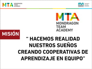 Mondragon Team Academy ofrece programas de aprendizaje autogestionado para emprendedores de equipo. Sus programas incluyen títulos universitarios y posgrados en liderazgo emprendedor e innovación, así como programas profesionales básicos. El aprendizaje se basa en el método de "aprender haciendo" a través de proyectos reales y empresas cooperativas. El objetivo es que los emprendedores dirijan su propio aprendizaje mediante contratos de aprendizaje y evaluación continua para alcanzar sus met