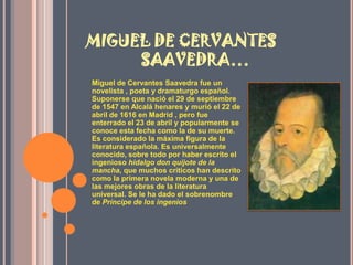 El documento rinde homenaje a Miguel de Cervantes Saavedra, escritor español conocido principalmente por haber escrito la novela Don Quijote de la Mancha. Brevemente describe la vida y obras de Cervantes, así como de otros destacados escritores latinoamericanos como Gabriel García Márquez y su novela Cien Años de Soledad, y el poeta y ensayista mexicano Octavio Paz.