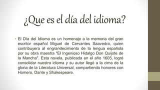 El documento habla sobre el Día del Idioma. Explica que se celebra el 23 de abril en homenaje a Miguel de Cervantes Saavedra, escritor español que consolidó el idioma español con su obra maestra "El ingenioso hidalgo Don Quijote de la Mancha". También menciona que la palabra idioma proviene del griego y significa la manera de expresarse de un pueblo. Finalmente, indica que en Colombia se instituyó el Día del Idioma en 1938 para conmemorar el aniversario de la muerte de