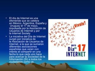 El Día del Internet se celebra el 17 de mayo en varios países y fue impulsado por la Asociación de Usuarios de Internet y la Internet Society para acercar la sociedad de la información a los ciudadanos. La iniciativa surgió en España en 2004 y se fijó el 17 de mayo como fecha luego de la declaración de Túnez, con el objetivo de que se celebre en todo el mundo.