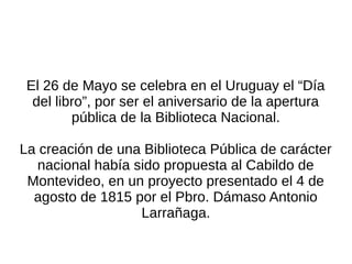 El documento habla sobre el Día del Libro en Uruguay, el cual se celebra el 26 de mayo en conmemoración de la apertura pública de la Biblioteca Nacional. En 1815, el sacerdote Dámaso Antonio Larrañaga propuso la creación de una biblioteca pública nacional en Uruguay. Finalmente, la biblioteca se inauguró el 26 de mayo de 1816 en el Fuerte de Montevideo, con Larrañaga como su primer director.