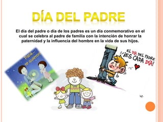 El día del padre celebra la paternidad y la influencia positiva de los padres en la vida de sus hijos. El padre juega un papel importante en la familia y la sociedad al ser modelo a seguir para sus hijos no solo a través de la interacción directa sino también por medio del ejemplo que establece con su comportamiento. Los padres sirven como referentes para sus hijos y pueden asegurar que son una influencia positiva a través de abordar sus preocupaciones y compartir sus vidas con una perspectiva constructiva.