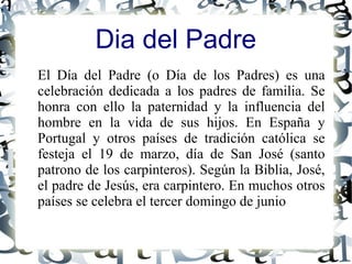 El documento habla sobre el Día del Padre, que se celebra el 19 de marzo en honor a San José. Explica que un padre es aquella persona que cuida y guía a sus hijos, apoyándolos y queriendo lo mejor para ellos. También destaca la importancia de la figura paterna para el desarrollo de los hijos. Finalmente, incluye una oración dirigida a Dios pidiendo su protección sobre los padres y los hijos.