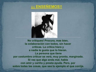 El documento ofrece consejos sobre la enseñanza como mantener una actitud positiva, no criticar a otros, tratar a todos con amabilidad, y despertar a los estudiantes sin permitir que la rutina destruya su vida y aprendizaje. También incluye reflexiones sobre tener fe en uno mismo y en Dios, y mantener siempre una actitud de optimismo.