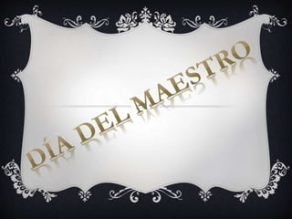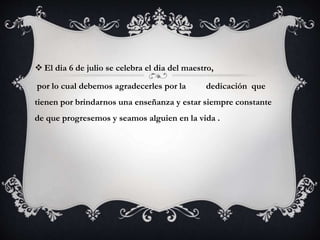 El documento habla sobre el Día del Maestro, celebrado el 6 de julio, y agradece a los maestros por su dedicación a la enseñanza y por ayudar a los estudiantes a progresar. Incluye un poema para el maestro que destaca su inteligencia, justicia y ayuda a los estudiantes, y merece una nota de 20. También incluye un poema sobre un profesor Abraham que recogió una computadora caída del cielo y comenzó a enseñar computación.