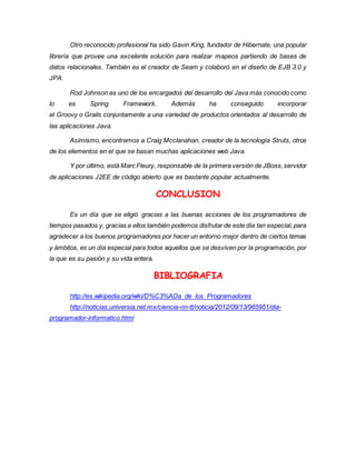 El documento habla sobre el Día del Programador, una festividad oficial en Rusia que se celebra el 13 de septiembre. Este día conmemora las contribuciones de los programadores y se eligió la fecha porque el 13 de septiembre es el día 256 de un año normal, un número significativo para los programadores. El documento también menciona a algunos de los programadores más influyentes como James Gosling y Gavin King.