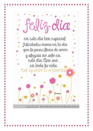 Este documento contiene varias reflexiones sobre el amor y el sacrificio de una madre. Resalta que una madre es capaz de dar todo por sus hijos sin esperar nada a cambio, manteniendo la fe en ellos incluso cuando los demás la han perdido. También destaca la dedicación y entrega de una madre hacia su familia anteponiendo su felicidad a la de sus hijos.