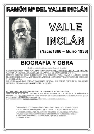 El documento presenta biografías y extractos de obras de varios escritores españoles pertenecientes a la Generación del 98 como Azorín, Valle-Inclán y Unamuno. Incluye información biográfica sobre su lugar de nacimiento, formación y principales obras literarias. También presenta fragmentos característicos del estilo y temáticas de cada autor.