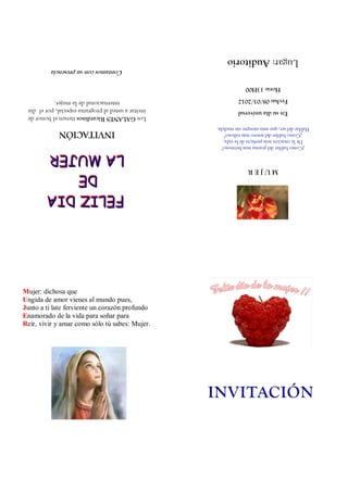La invitación invita a asistir a un programa especial el Día Internacional de la Mujer en el Auditorio a las 13H00 del 08/03/2012. El programa celebrará a la mujer como la creación más perfecta que ama sin medida y late ferviente un corazón profundo junto a su pareja.