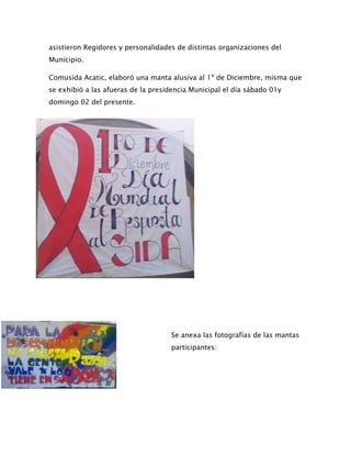 Comusida Acatic organizó un concurso de pintura en mantas para estudiantes de secundaria y preparatoria sobre el Día Mundial de Respuesta al SIDA. Ocho estudiantes se inscribieron y seis presentaron sus mantas. El 1 de diciembre se premió a los tres estudiantes con los mejores diseños: el primer lugar fue para Maricela Gama Alatorre, el segundo para Luz María Guzmán Flores y el tercer lugar para Nancy Gómez Jiménez.