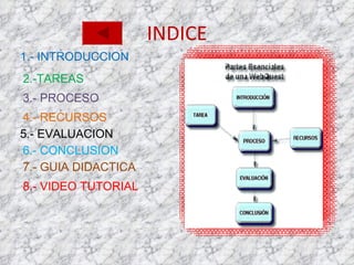 El documento presenta los elementos clave de una WebQuest educativa, incluyendo una introducción, tareas, proceso, recursos, evaluación, conclusión, guía didáctica y video tutorial. Explica cada sección y su propósito, como orientar a los estudiantes sobre el tema y objetivos, describir las tareas a completar, guiarlos a través del proceso de aprendizaje, proveer recursos seleccionados, establecer criterios de evaluación y promover la reflexión.