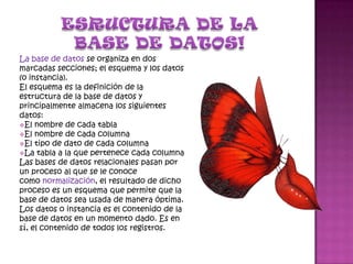 Este documento describe los conceptos básicos de las bases de datos, incluyendo su estructura en esquema y datos, el proceso de normalización, y la diferencia entre una base de datos y un sistema de gestión de bases de datos. También explica conceptos como tablas, consultas, formularios, informes y macros, que son elementos clave para el diseño y uso de bases de datos.