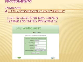 Un WebQuest es una herramienta de aprendizaje guiado que utiliza recursos de Internet para promover habilidades cognitivas superiores, trabajo cooperativo y autonomía estudiantil. Se basa en retos de aprendizaje mediante tecnologías de información y comunicación. El documento explica los pasos para crear un WebQuest en la página web phpWebQuest.org, incluyendo solicitar una cuenta, seleccionar un nivel educativo y asignatura, crear la estructura del WebQuest con cinco actividades (introducción, tarea, proceso, evalu
