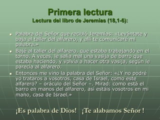 El documento presenta las lecturas bíblicas de un domingo: la primera lectura del profeta Jeremías, el salmo responsorial 145, y el evangelio de san Mateo sobre la parábola de la red. Luego incluye oraciones, meditaciones y reflexiones relacionadas con las lecturas sobre el poder y la justicia de Dios, y la necesidad de discernimiento.