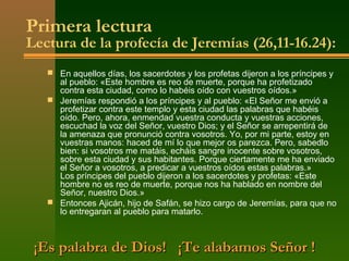 El documento resume la primera lectura de Jeremías sobre la profecía de Jeremías y su persecución, el salmo responsorial pidiendo favor de Dios, y el evangelio de Mateo sobre la muerte de Juan el Bautista a manos de Herodes debido a la petición de su hijastra durante su cumpleaños.