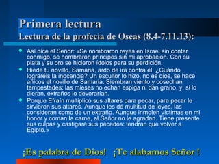 El documento presenta las lecturas para la misa del domingo, incluyendo una lectura del profeta Oseas, un salmo y el Evangelio de San Mateo sobre Jesús curando a un hombre mudo poseído por un demonio. Señala que Cristo desea seguir curando pero necesita más trabajadores para su cosecha.