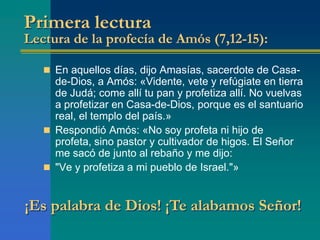 El documento resume las lecturas de la misa del día. La primera lectura habla de Amós y su llamado a profetizar. La segunda lectura de san Pablo destaca la gracia y redención que Dios nos da en Cristo. El Evangelio narra cómo Jesús envía a los doce apóstoles de dos en dos a predicar.
