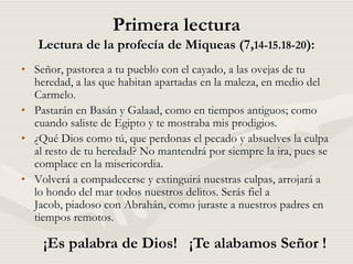 Este documento presenta las lecturas para una misa dominical, incluyendo una lectura de la profecía de Miqueas, un salmo responsorial, y el Evangelio según San Mateo sobre Jesús diciendo que aquellos que hacen la voluntad de Dios son su verdadera familia. Luego incluye oraciones, meditaciones y reflexiones relacionadas con vivir de acuerdo a la voluntad de Dios.
