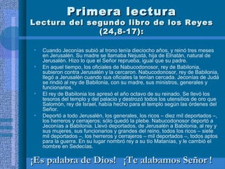 El documento presenta tres lecturas bíblicas. La primera lectura narra la deportación del rey Jeconías de Jerusalén a Babilonia. El salmo responsorial pide a Dios que libere a su pueblo. El evangelio describe a Jesús advirtiendo a sus discípulos sobre la importancia de construir su vida sobre la roca firme de Dios mediante la obediencia a su voluntad.