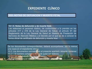 Este documento establece las normas para la elaboración de notas de defunción y muerte fetal por el personal médico, de acuerdo a la legislación mexicana. Indica que al menos una copia de estos documentos debe incluirse en el expediente clínico del paciente. Además, especifica que dichos documentos deben contener el nombre completo y firma de quien los elabora, así como la fecha y hora.