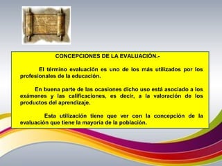Este documento presenta diferentes concepciones de la evaluación educativa. Explica que la evaluación se suele asociar con exámenes y calificaciones para medir resultados del aprendizaje. Luego, propone que la evaluación también puede usarse para observar procesos de aprendizaje y comprender cómo los estudiantes construyen significado. Finalmente, ofrece algunos modelos e instrumentos para realizar evaluaciones formativas basadas en observación, entrevistas y técnicas conductuales.