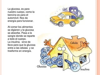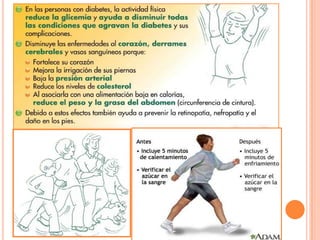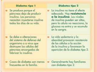 Este documento explica qué es la diabetes, sus tipos principales (tipo 1 y tipo 2), sus síntomas, exámenes de detección, complicaciones a largo plazo si no se controla (daños a ojos, riñones, pies y corazón) y la importancia del control glucémico, dieta, ejercicio y medicamentos como la insulina.