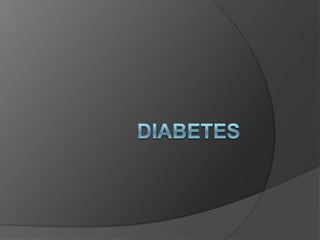Este documento describe la diabetes tipo 1 y tipo 2. La diabetes tipo 1 se debe a que el páncreas no produce insulina debido a un trastorno autoinmune. Sus síntomas incluyen sed excesiva, hambre, fatiga y visión borrosa. Se diagnostica mediante niveles de glucosa en sangre y hemoglobina A1c. Su tratamiento implica dieta, inyecciones o bomba de insulina y ejercicio. Puede generar complicaciones como retinopatía, úlceras, cardiopatías y daño renal. La diabetes tipo 2 se