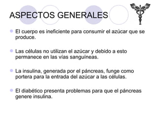 Este documento trata sobre la diabetes. Explica que la diabetes ocurre cuando el cuerpo es ineficiente para consumir el azúcar en la sangre debido a una falta de insulina o resistencia a la insulina. Discutes dos tipos principales de diabetes, así como las complicaciones agudas y crónicas. Finalmente, ofrece recomendaciones para la prevención de la diabetes, incluyendo mantener una dieta saludable, hacer ejercicio regularmente y someterse a exámenes médicos periódicos.