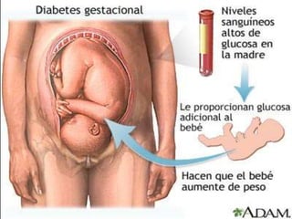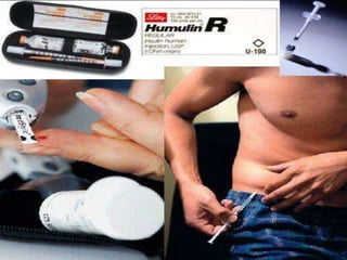 La diabetes es una enfermedad crónica causada por la falta de insulina o resistencia a la insulina. Existen varios tipos de diabetes definidos por sus causas y tratamientos. La diabetes tipo 1 se debe a una falta de producción de insulina, mientras que la tipo 2 involucra resistencia a la insulina. La diabetes gestacional ocurre durante el embarazo. El control de la glucosa a través de la dieta, ejercicio e insulina puede prevenir complicaciones graves a largo plazo. Actualmente no existe cura para la diabetes.