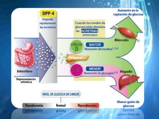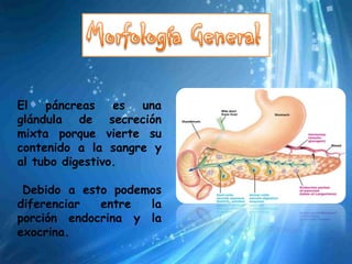 El páncreas es una glándula mixta que segrega jugo pancreático y hormonas. Tiene una porción exocrina que secreta jugo pancreático para ayudar en la digestión y una porción endocrina formada por los islotes de Langerhans que producen insulina y glucagón para regular los niveles de glucosa en la sangre. La diabetes es un trastorno del metabolismo de la glucosa que puede deberse a deficiencia de insulina o resistencia a la insulina y causa hiperglucemia.