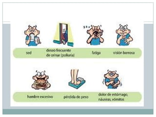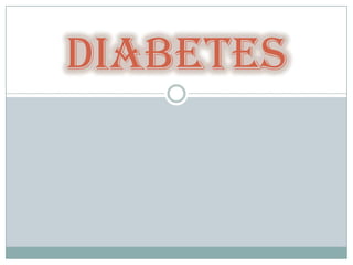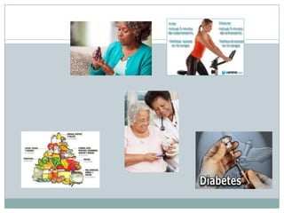 Este documento trata sobre la diabetes y provee información sobre qué es, sus causas, tipos, síntomas, cómo evitarla y su tratamiento. Explica que la diabetes es una enfermedad crónica relacionada con la insulina y puede afectar a personas mayores de 70 años. Describe los tipos 1 y 2 de diabetes y sus síntomas como sed, hambre y visión borrosa. Recomienda evitarla mediante dieta saludable y ejercicio, y su tratamiento incluye insulina y medicamentos.