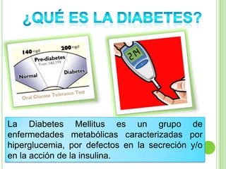 Este documento resume los principales aspectos de la diabetes mellitus. Explica que la diabetes es un grupo de enfermedades metabólicas caracterizadas por la hiperglucemia causada por defectos en la secreción o acción de la insulina. Además, señala que la diabetes es un problema creciente de salud pública y una de las principales causas de muerte y discapacidad. Finalmente, describe los cinco principales tipos de diabetes y sus características.