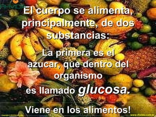 El documento explica cómo el cuerpo obtiene energía de la glucosa y el oxígeno transportados por la sangre, y el papel clave de la insulina en permitir que la glucosa pase de la sangre a las células. La diabetes ocurre cuando el cuerpo no produce suficiente insulina, impidiendo que la glucosa entre a las células. Se enfatiza la importancia de evitar el sobrepeso, hacer ejercicio y comer saludablemente para prevenir la diabetes y no agotar la capacidad del páncreas de producir insulina.