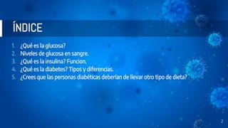 Este documento trata sobre la glucosa, la insulina y la diabetes. Explica que la glucosa es el principal combustible de las células y que los niveles de glucosa en sangre deben mantenerse en un rango para evitar hipoglucemia e hiperglucemia. También describe la insulina como la hormona que controla los niveles de glucosa y permite a las células absorberla. Finalmente, define los tipos de diabetes y explica que las personas diabéticas deben seguir una dieta especial para controlar su condición.