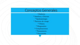 El documento presenta una introducción general sobre la diabetes, incluyendo su definición, tipos, factores de riesgo, síntomas, diagnóstico y tratamiento. Explica que la diabetes ocurre cuando el páncreas no produce suficiente insulina o cuando el cuerpo no usa eficazmente la insulina, y ha aumentado rápidamente en países de ingresos medios y bajos. El tratamiento incluye dieta saludable, actividad física e inyecciones de insulina. La prevención se enfoca en mantener un peso saludable y est