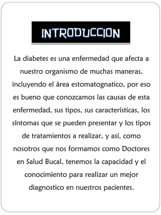La diabetes es una enfermedad crónica caracterizada por altos niveles de azúcar en la sangre, causada ya sea por poca producción de insulina, resistencia a la insulina, o ambas. Existen tres tipos principales de diabetes: tipo 1 se debe a poca producción de insulina; tipo 2 se debe a resistencia a la insulina; y la diabetes gestacional ocurre durante el embarazo. La diabetes afecta la boca y es importante que los dentistas la diagnostiquen correctamente y brinden el tratamiento adecuado a pacientes con esta condic