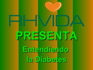 El documento explica la diabetes, una enfermedad que ocurre cuando el cuerpo no produce suficiente insulina o no puede usarla eficazmente. La insulina es necesaria para transportar el azúcar de la sangre a las células para producir energía. Sin suficiente insulina, el azúcar se acumula en la sangre en lugar de ingresar a las células. El documento también destaca que la diabetes comienza años antes de que aumente el azúcar en la sangre y se desarrolla cuando las personas engordan, no hacen ejercicio y comen
