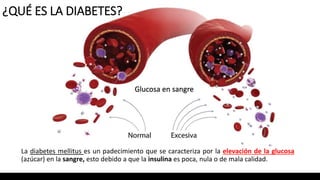 La diabetes es un padecimiento caracterizado por niveles altos de glucosa en la sangre debido a una falta o deficiencia de insulina. La insulina es una hormona producida por el páncreas que permite que la glucosa ingrese a las células para producir energía. Si no hay suficiente insulina, la glucosa permanece en la sangre en niveles peligrosos. Existen dos tipos principales de diabetes - tipo 1 causada por la destrucción de las células que producen insulina, y tipo 2 asociada con resistencia a la ins