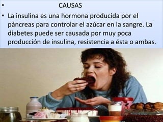 La diabetes es una enfermedad crónica en la que el cuerpo no puede regular la cantidad de azúcar en la sangre. Existen dos tipos principales de diabetes: la diabetes tipo 1 se caracteriza por la falta de producción de insulina y requiere inyecciones diarias, mientras que la diabetes tipo 2 es más común y se asocia con la obesidad. Los síntomas incluyen visión borrosa, sed excesiva, fatiga y micción frecuente. El tratamiento involucra medicamentos, dieta y ejercicio para controlar los niveles de azú