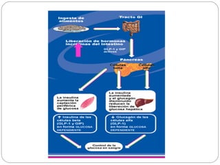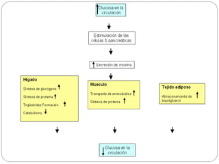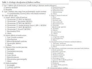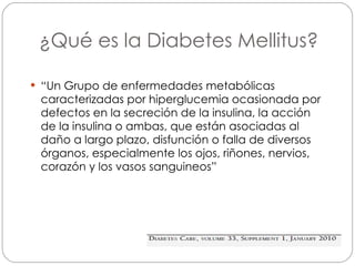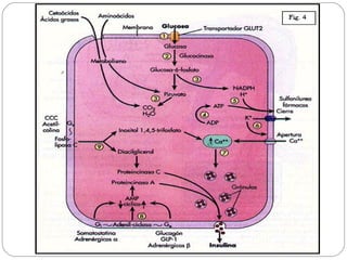 El documento describe la diabetes mellitus, incluyendo su definición como un grupo de enfermedades metabólicas caracterizadas por hiperglucemia. Explica el papel clave del páncreas y las células beta en la regulación de los niveles de glucosa a través de la secreción de insulina y glucagón. También describe cómo factores como la glucotoxicidad y lipotoxicidad pueden dañar las células beta y contribuir a la disfunción que ocurre en la diabetes tipo 2.