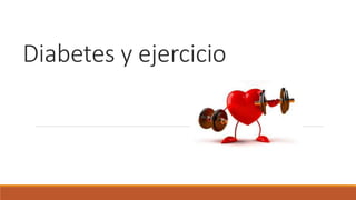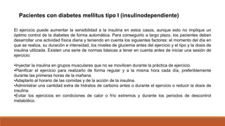 El documento describe los beneficios del ejercicio para los pacientes con diabetes tipo 1 y proporciona pautas para realizar ejercicio de manera segura. Específicamente, señala que el ejercicio puede aumentar la sensibilidad a la insulina, pero los pacientes deben desarrollar una rutina de actividad física diaria teniendo en cuenta factores como el momento del día, la duración e intensidad del ejercicio y los niveles de glucosa. También proporciona recomendaciones sobre el tipo y duración ideal de ejercicio, así como prec