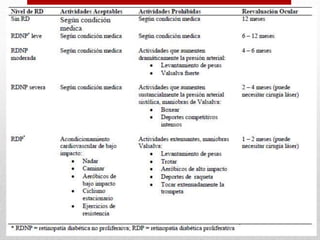 El documento habla sobre la evaluación médica necesaria antes de realizar ejercicio para personas con diabetes, incluyendo revisar la historia clínica, edad, duración de la diabetes, y posible presencia de complicaciones como microangiopatía, nefropatía o neuropatía autonómica. También cubre recomendaciones para sesiones de ejercicio como calentamiento, ejercicio a intensidad moderada de 30-40 minutos controlando los niveles de glucosa, y enfriamiento al final.